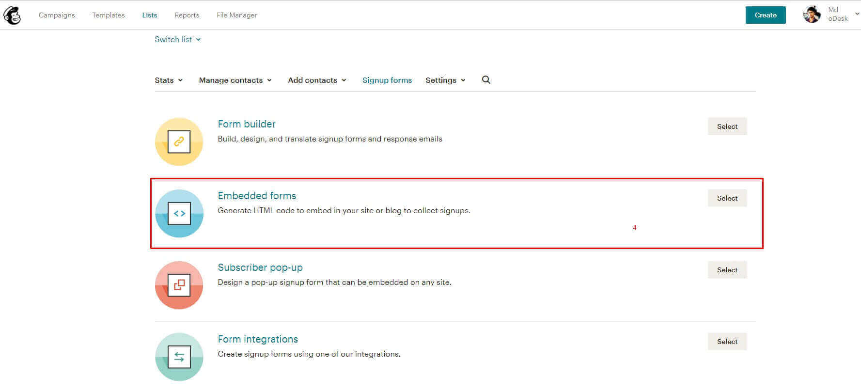 1. Log into your MailChimp account and click on the List from the top menu. Create a mailing list